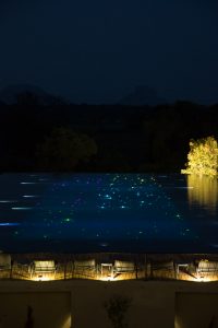 En effet, la nuit de petites lumières colorées s’allument au fond de la piscine et produisent un spectacle superbe.